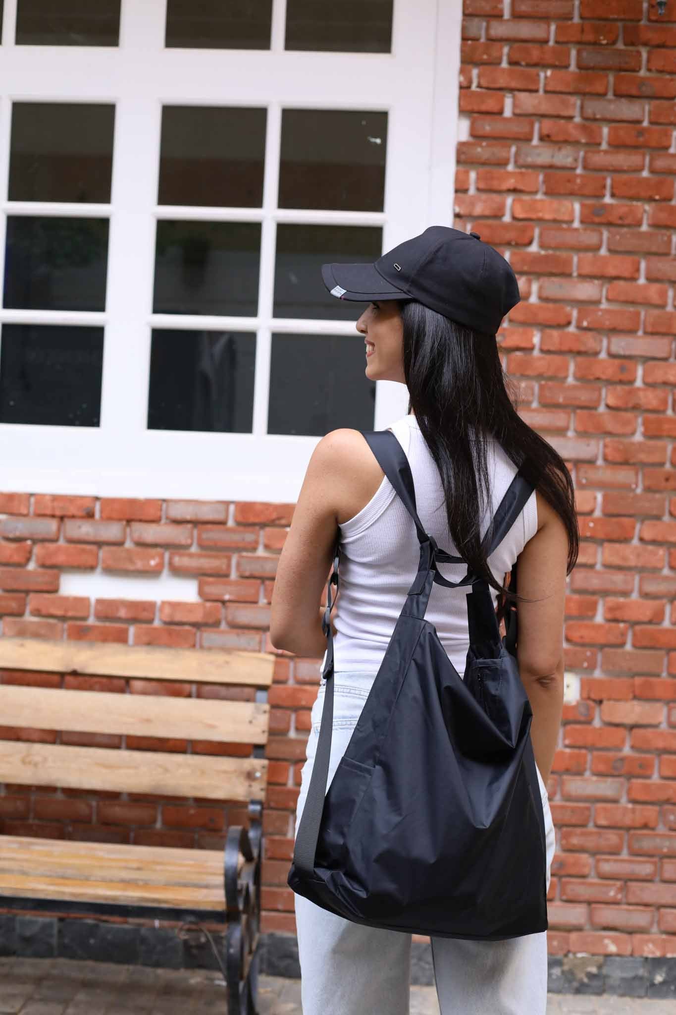 A multiple-use bag that can be used as a shoulder bag or a backpack.